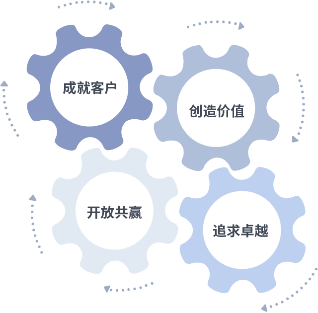 成就客户是一切决策的出发点,,,,创造价值是衡量所有工作的标准,,追求卓越是我们做事做人的态度,,,,开放共赢是我们的格局也是最终的结果。。价值观的齿轮环环相扣,,,推动着组织里的每个人不断向前。。。
